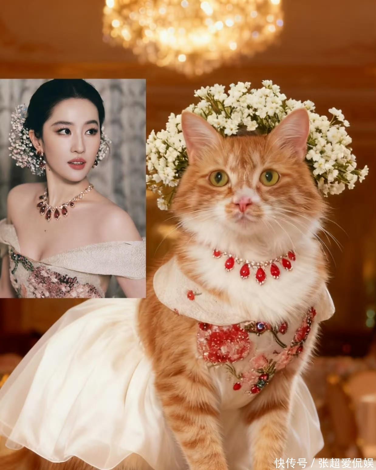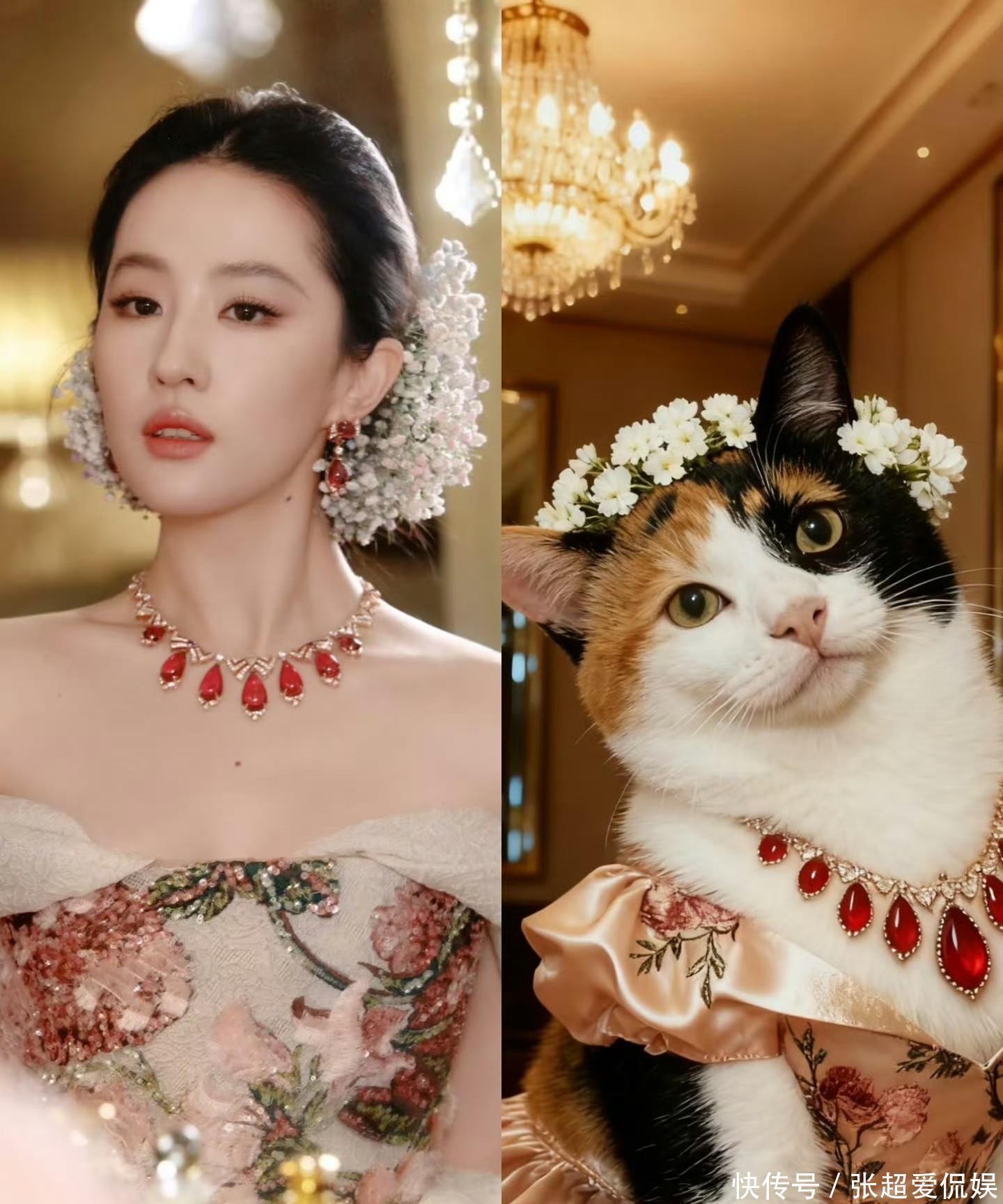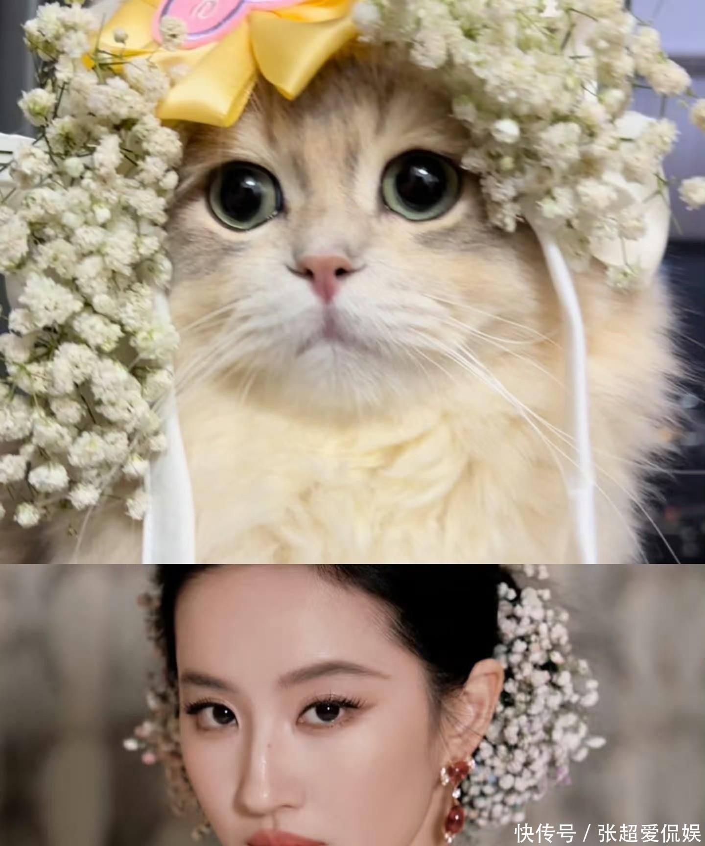 这造型一爆,全网直接掀起“模仿大赛”,离谱程度超出想象!小红书、抖音上全是#我复刻了刘亦菲满天星妆造#的视频,刚开始是小姐姐们扎同款盘发、插假花,后来小朋友的“迷你花神妆”也火了,最绝的是养宠物的网友——给猫咪戴小满天星发夹,给狗狗梳圆头帘配碎花项圈,评论区全在喊“猫猫狗狗都比我精致”,话题播放量没几天就破了亿。